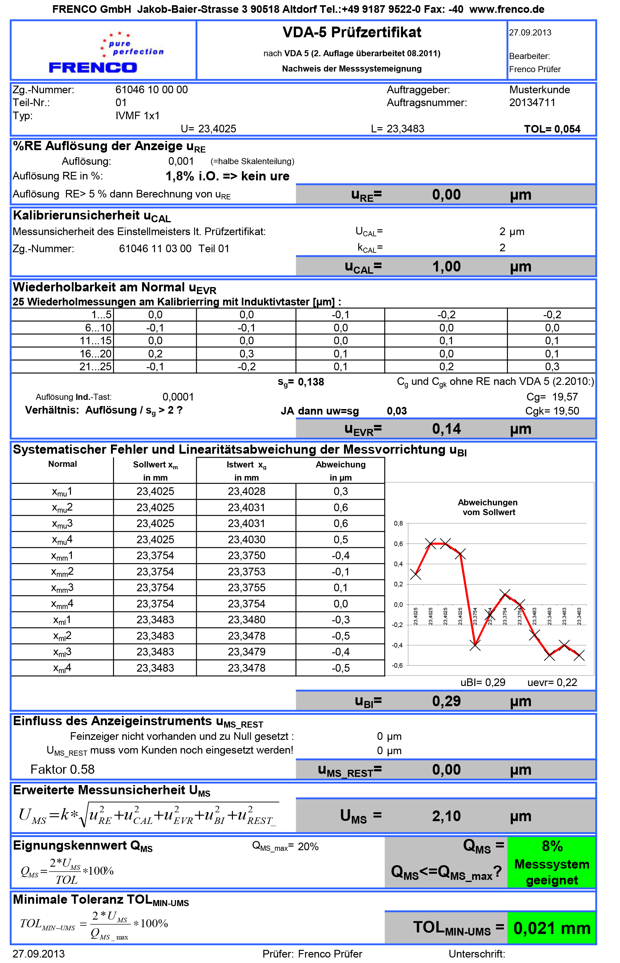Für Messgeräte der Produktgruppe V (Zweikugelmaß-Prüfgeräte) liefert FRENCO Ihnen auf Wunsch ein VDA 5-Prüfzertifikat. Dieses Zertifikat beinhaltet unter anderem den Messunsicherheitsbeitrag des Prüfmittels, also des Messsystems.